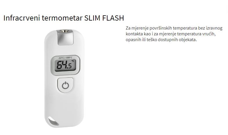 Pomoću “SLIM FLASH” infracrvenog termometra možete brzo i lako izmjeriti temperaturu površina bez dodirivanja. Usmjerite ga prema cilju, pritisnite gumb, a rezultat ćete dobiti u nekoliko sekundi. Uređaj ima robusno metalno kućište i može stati u svaki džep.